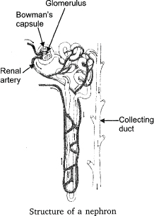 Ans. Structure of nephrons: It consists of a Bowman’s capsule in which glomerulus is present (cluster of capillaries). The afferent artery brings the impure blood to nephron. The cup shaped structure (Bowman’s capsule) form a tubular part of nephron which leads to collecting duct.