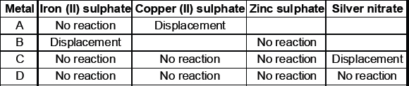 Use the table above to answer the following questions, about metals A, B, C and D.