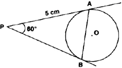 11.   In the following figure, PA and PB are two tangents drawn to a circle with centre O, from an external point P such that PA = 5 cm and ∠APB = 60°. Find the length of chord AB.