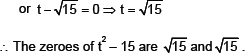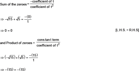 Thus, the relationship between the zeroes and the coefficients in the polynomial t2 – 15 is verified.