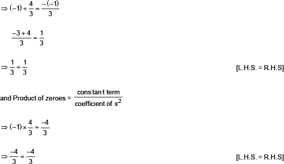Thus, the relationship between the zeroes and the coefficients in 3x2 – x – 4 is verified.