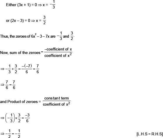Thus, the relationship between the zeroes and the coefficients in the polynomial 6x2 – 3 – 7x is verified.
