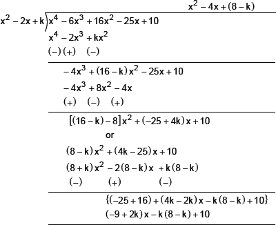Sol. Applying the division algorithm to the polynomials x4 – 6x3 + 16x2 – 25x + 10 and x2 – 2x + k, we have: