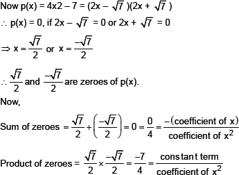 2.  Find the zeroes of 4x2 – 7 and verify the relationship between the zeroes and its coefficients.