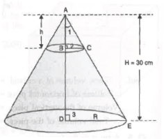 6. The height of a cone is 30 cm. A small cone is cut off at the top by a plane parallel to the base. If its volume be