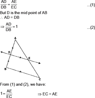 ⇒ E is the mid point of AC: Hence lii is proved tht “a line through the Mid-point of one side of a triangle parallel to another side bisects the third side.”