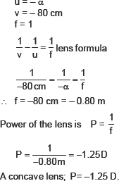 Q6. The far point of a myopic person is 80 cm in front of the eye. What is the nature and power of the lens required to correct the problem?
