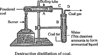 The process of heating coal in the absence of air is called the destructive distillation of coal. Coal contains a number of elements such as carbon, hydrogen, oxygen, nitrogen and sulphur. When coal is heated in the absence of air, a number of products are obtained.