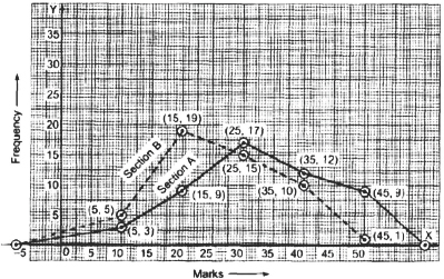 We plot the ordered pairs (5, 3), (15, 9), (25, 17), (35, 12) and (45, 9) and join the points by line segments and obtain the frequency polygon of section A. Again, to obtain the frequency polygon of section B, we plot the points (5, 5), (15, 19), (25, 15), (35, 10) and (45, 1) on the same coordinate axes and join these points by dotted linesegments.