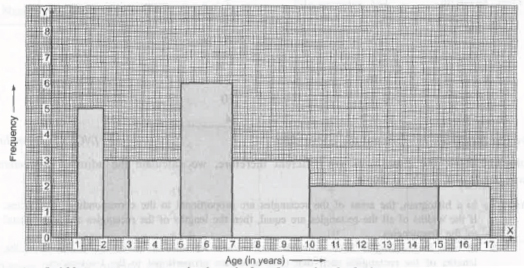 Now, we draw the histogram taking ages (in years) on the x-axis and corresponding adjusted frequencies on the y-axis as shown below: