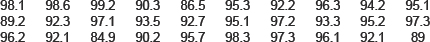 So the classes are: 84 – 86, 86 – 88, 88 – 90, 90 – 92, ..., 98 – 100.