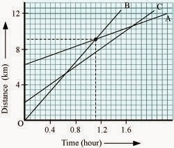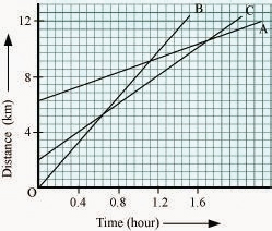 6.  Fig 8.11 shows the distance-time graph of three objects A, B and C. Study the graph and answers the following questions: