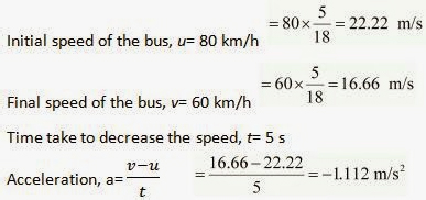 2.  A bus decreases its speed from 80 km h-1 to 60 km h-1 in 5 s. Find the acceleration of the bus.