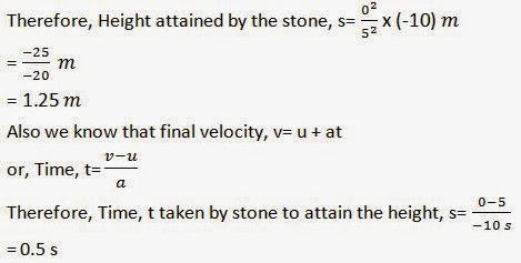 5.  A stone is thrown in a vertically upward direction with a velocity of 5 m s-1. If the acceleration of the stone during its motion is 10 m s-2 in the downward direction, what will be the height attained by the stone and how much time will it take to reach there?