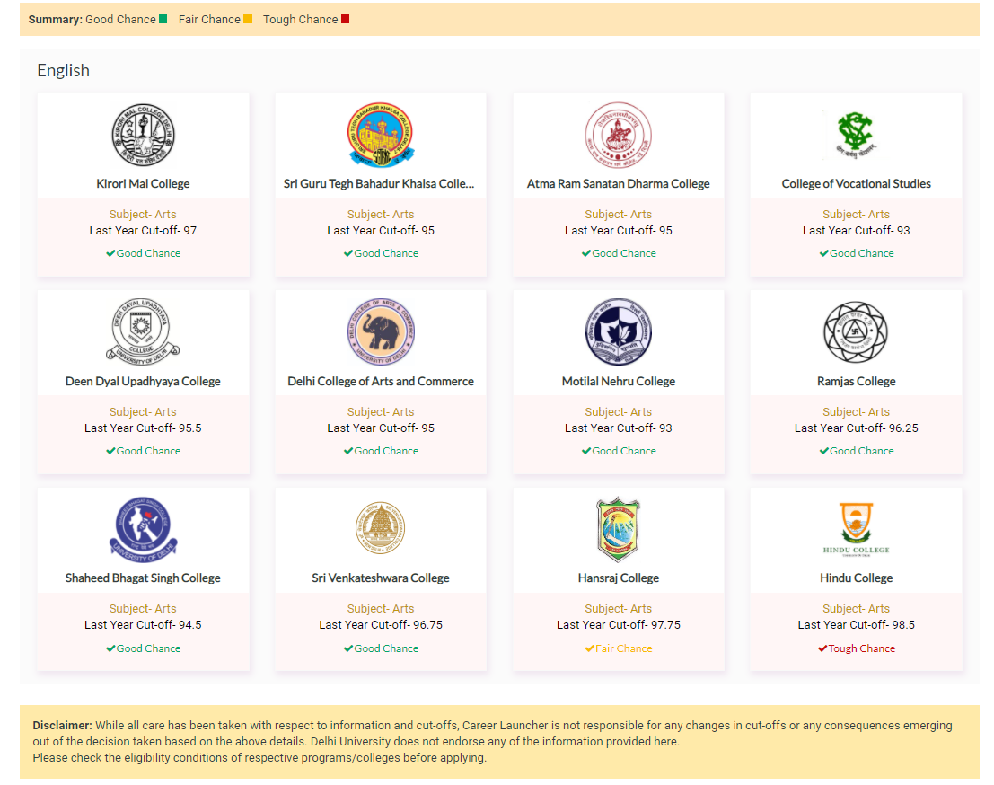 Finding the right mix of college and courses is a tough task, when it comes to undergraduate admissions, more so about Delhi University. With more than 60 colleges and 100+ courses, it is a challenging task to get the right match. With Delhi University college predictor, you can overcome this challenge. All you need is to provide your basic details about courses you look forward to along with your class XII details, and the predictor will give you the course-college matrix in quick time. Based on last year cut-offs across different categories and courses, the Delhi University College predictor will help you sort the best possible option. So, what are you waiting for! Explore the best opportunity for yourself through the Delhi University College Predictor.