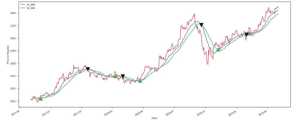 3. Plot the appropriate trade calls for the given stock data. Use 21 day and 34 day moving averages to get the appropriate predictions for the calls.